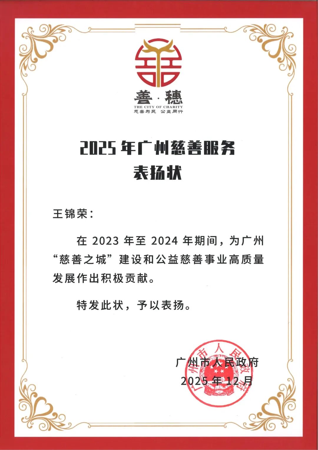 在2025年“中国公益慈善项目交流展示会”上,主办方公布了广州市人民政府关于2025年广州慈善服务的表扬对象,集团王锦荣董事长荣获2025年广州慈善服务表扬状。