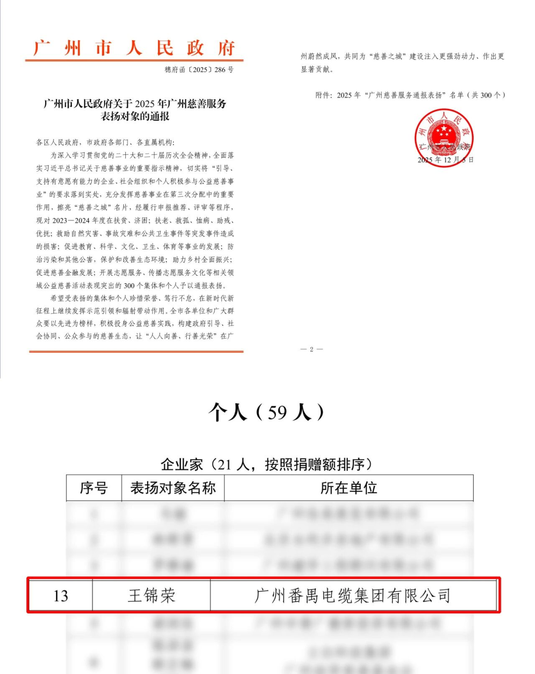 近日,广州市人民政府发布《关于2025年广州慈善服务表扬对象的通报》(穗府函〔2025〕286号),番缆集团王锦荣董事长以公益慈善领域的扎实表现,成功入选2025年 “广州慈善服务通报表扬” 名单。