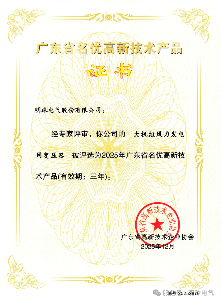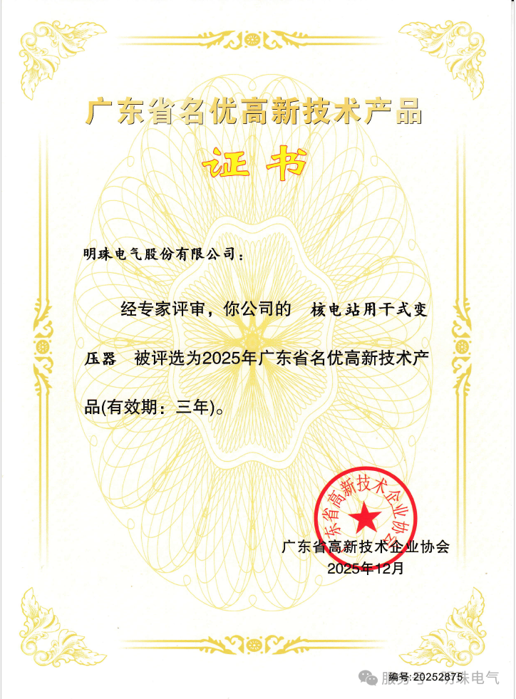 近日,明珠电气研发的核电站用干式变压器、大机组风力发电用变压器、高效节能干式变压器三款产品,成功入选“2025年度广东省名优高新技术产品”名单,再次彰显了公司在技术创新与产品实力方面获得的权威认可。