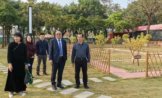 王锦荣先生与番禺区统战部副部长、工商联党组书记、常务副主席岑镜洪一同前往海傍村同心文化公园视察。两人漫步公园,海傍村党委成员介绍,同心文化公园启用后大人晨运打拳、傍晚散步,孩童放学后在此嬉笑嬉戏,邻里齐聚切磋技艺,昔日闲置地变身全年龄段共享空间。双方围绕如何进一步完善公园设施、丰富文化内涵、打造乡村文化地标等话题深入交流。