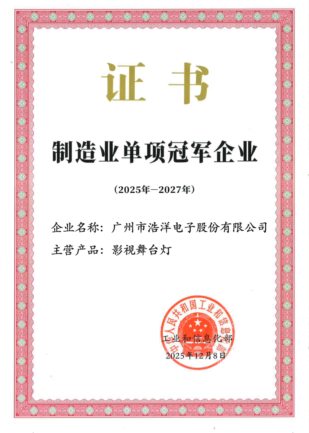 近日,工业和信息化部公示了国家级制造业单项冠军企业复核通过名单,广州市浩洋电子股份有限公司(股票简称:浩洋股份,股票代码:300833.SZ)凭借在影视舞台灯光领域的深耕细作、全球领先的市场地位及强劲的创新能力,成功蝉联该项殊荣,再度彰显了其在细分领域的龙头标杆地位,为制造业高质量发展注入强劲动力。