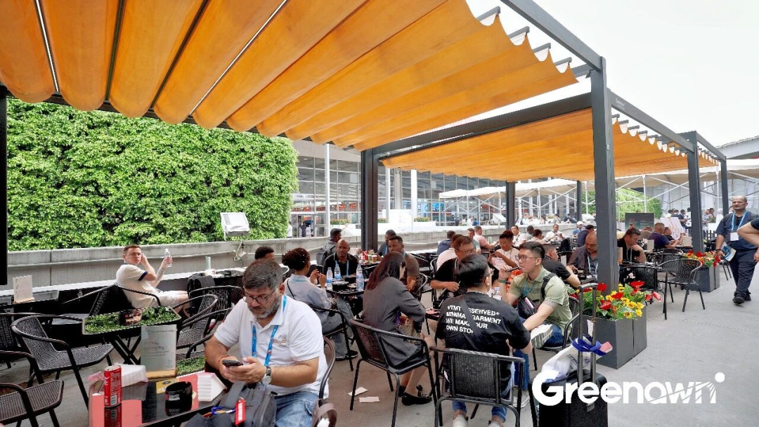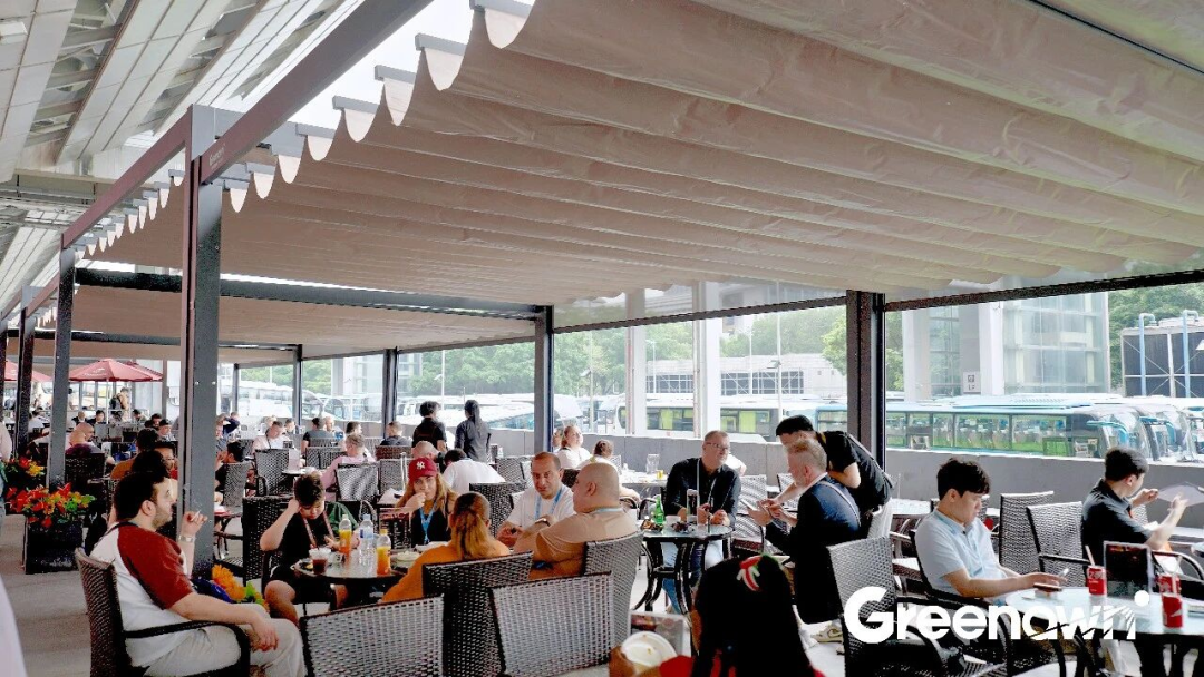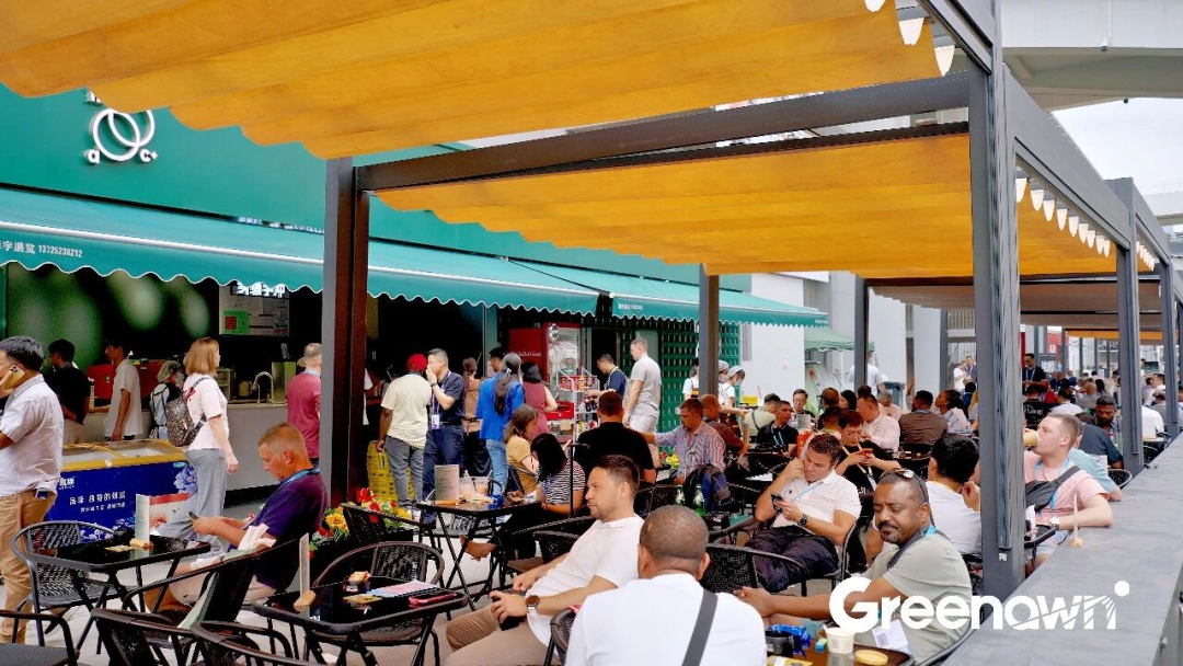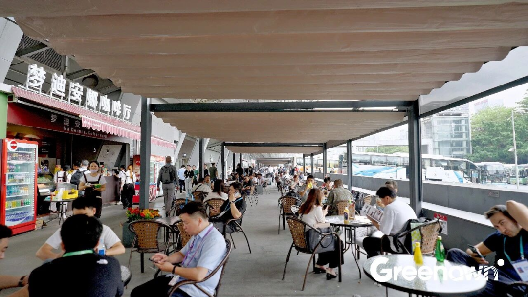 外国客商普遍钟爱室外社交与餐饮氛围。在繁忙的看展、洽谈间隙,格绿朗打造的咖啡外摆休闲区了最受欢迎的“中转站”。波浪篷时尚的流线造型与现代配色,与广交会展馆建筑相得益彰,高低错落的排列更形成一道亮丽的风景线。
