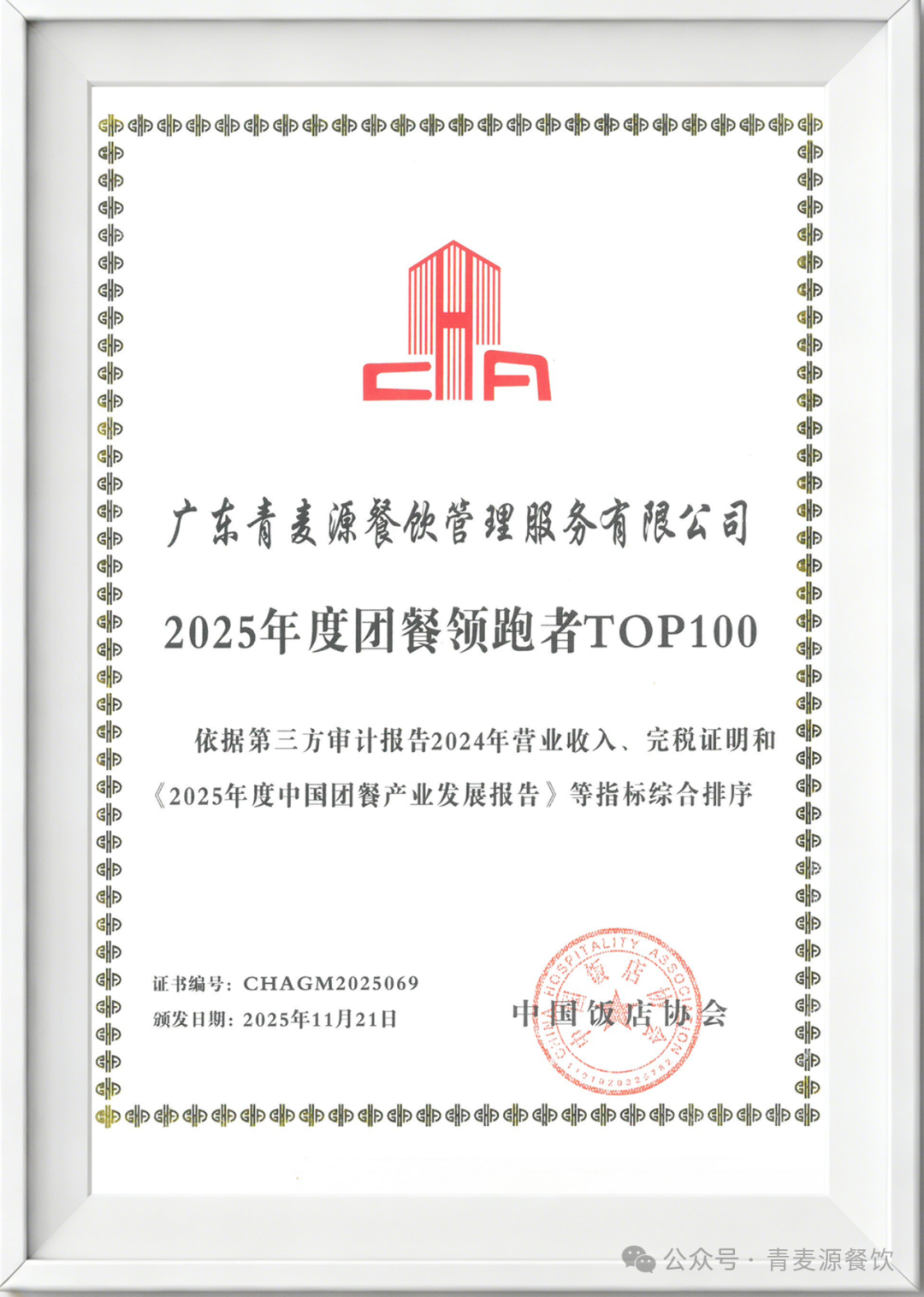 11月20日至23日,第十一届中国团餐产业发展大会在山东烟台圆满落幕。大会现场权威揭晓了“2024年全国团餐配送百强企业实力榜”,青麦源集团不负众望,连续第九年强势登榜!这份沉甸甸的荣誉,是对我们长久以来坚守品质与服务的最佳褒奖,更是属于每一位信任与支持青麦源的您!本届大会以“强链固本·智通未来”为主题,与青麦源的发展路径不谋而合。