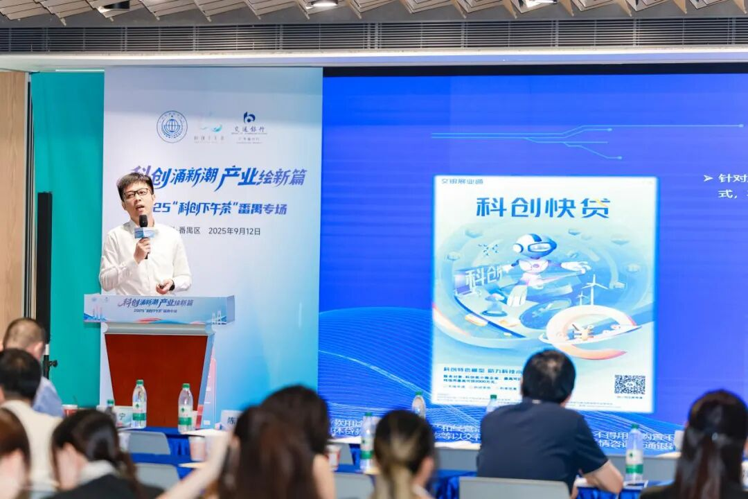 交通银行广州番禺支行副行长曲家悦宣讲金融政策,介绍了科创人才贷、科创粤新贷、科创快贷、高新贷、专精特新贷等针对科技企业的特色金融产品与服务方案。