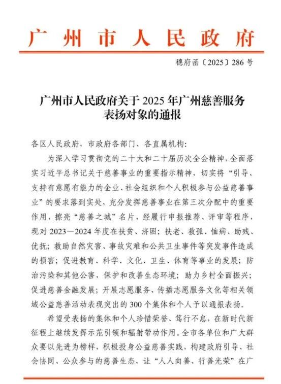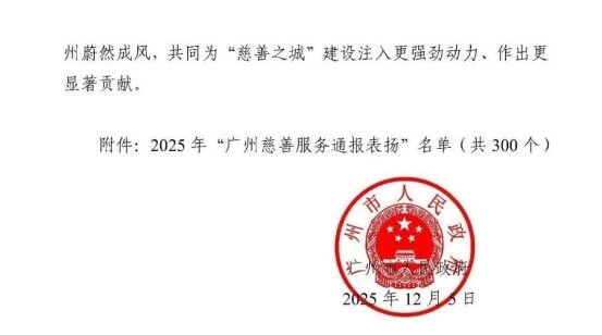 12月10日,广州市人民政府发布了关于2025年广州慈善服务表扬名单的通报,对2023-2024年度全市慈善服务领域表现突出的300个集体与个人予以通报表扬。