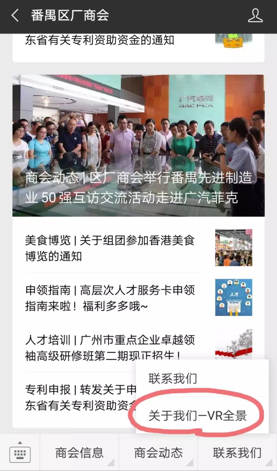 有兴趣了解厂商会会员企业全景VR拍摄的会员可在公众号关注“番禺区厂商会”,点击右下方“联系我们”,找到“关于我们—VR全景”